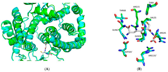 (A) Structural superposition of hGSTA1-K141H/S142H (cyan) onto hGSTA1-1−GSH (green) (PDB code: 1PKW) [28]. GSH is shown in stick representation. (B) Close-up comparison of hGSTA1-K141H/S142H and hGSTA1-1 (PDB code: 1PKW) active sites after superposition. The residues that are involved in GSH binding are Tyr9, Arg15, Arg45, Glu54, Val55, Gln67, and Thr68, and Asp101′ and Arg131′ from the second subunit. The structures of hGSTA1-K141H/S142H and hGSTA1-1− GSH are colored in cyan and green, respectively. The analysis was carried out using PyMOL Molecular Graphics System [30].