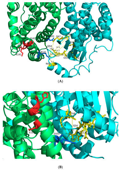 (A) Distances between R131′ and G-site residues of hGSTA1 (PDB code: 1PKZ [28]). (B) Distances between R131′ and G-site residues of hGSTA1-K141H/S142H. The distances are shown in dashed yellow lines. The G-site residues of the enzymes (Y9, R15, R45, Q54, V55, Q67, and T68) are presented in yellow. The two molecules of the dimer are shown in lime green and cyan. The residues D101 and R131 of the second molecule in the dimer are presented in marine. The residues E137, K141, S142, H141, and H142 are presented in red. The analysis was carried out using the PyMOL Molecular Graphics System [30].