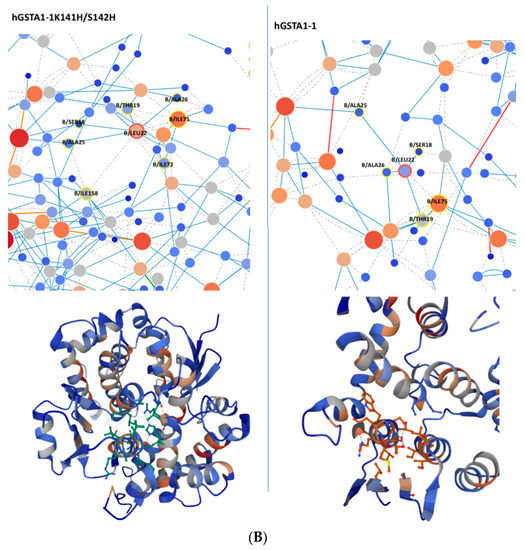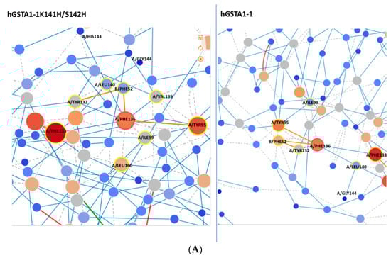 Another amino acid that is likely essential for the enhanced catalytic activity of the hGSTA1-1K141H/S142H is L22, which seems to form van de Waals interaction with I158 (Figure 10B) from helix H6. However, the same interaction is absent in the wild-type enzyme. I158 is considered an important structural element of the hydrophobic staple motif (L153 to I158) because of its hydrophobic interactions with the H1-helix (W21, L22, and A25), which are critical for the stability of hGSTA1-1 [14]. In addition, a difference in node degree for L22 from 5.00 to 7.00 can be seen in Figure 10B, suggesting that L22 of hGSTA1-K141H/S142H is involved in a more extended network of interactions in this mutant. The hydrophobic staple motif has a significant role in the folding of hGSTA1-1 and hGSTP1-1 [14,41]. According to our results, the increased number of interactions observed for L22 probably affects the structure of the hydrophobic staple motif.