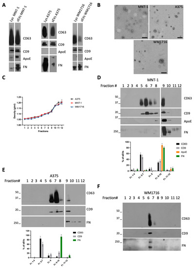 To characterize small EVs (sEVs) released by melanoma cells, we chose three (human) melanoma cell lines with different metastatic potential: MNT-1, a pigmented cell line, not tumorigenic when injected in mice [14], and A375 and WM1716, which are non-pigmented, metastatic, melanoma cell lines. Small extracellular vesicles (sEVs) were isolated from sub confluent cultures of MNT-1, A375, or WM1716 by differential ultracentrifugation. The 100,000× g pellets were recovered and analyzed by Western blot together with their respective cell lysates (Figure 1A). As previously shown, MNT1 cells express ApoE, an inhibitor of melanoma progression [15], and secrete ApoE through sEVs [16]. On the contrary A375 and WM1716 cells do not express ApoE, and hence EVs released by these cell lines are negative for ApoE. All three cell lines express and secrete fibronectin, which can be co-recovered with sEVs. The presence of fibronectin on EVs has been previously reported and proposed to promote cancer cell migration through interaction with collagen [9]. The presence of sEVs was confirmed by transmission electron microscopy (Figure 1B). To further characterize sEVs, and confirm the physical association of fibronectin with EVs, 100,000 g pellets were loaded onto a bottom-up density gradient. Twelve fractions were recovered, their density was measured (Figure 1C), and each fraction was analyzed by Western blot (Figure 1D–F). MNT1 cells release two main subpopulations of EVs, corresponding to fraction 6/7 (density range 1.08–1.10 g/mL) and to fraction 9/10 (density range 1.12–1.17 g/mL) (Figure 1D). Contrary to CD63 and CD9, ApoE and fibronectin were specifically enriched in fraction 9/10 (Figure 1D), suggesting the presence of distinct subpopulations of sEVs. Similarly, A375-derived sEVs distributed in different fractions between 1.08 g/mL and 1.17 g/mL, with fibronectin being highly enriched only in fraction 9/10 (Figure 1E). Contrarily, WM1716 distributed in a single fraction (fraction 6, density of 1.08 g/mL), with this fraction being also enriched in fibronectin (Figure 1F).