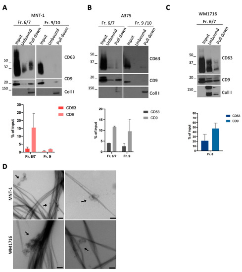 (A) WB analysis of a pull-down of collagen fibrils incubated with MNT-1 sEV fractions recovered from a bottom-up density gradient. Quantifications of the percentage of CD63- or CD9-positive vesicles that were pulled down with collagen are shown (mean ± SEM, 3 independent experiments). (B) WB analysis of a pull-down of collagen fibrils incubated with A375 sEV fractions recovered from a bottom-up density gradient. Quantifications of the percentage of CD63- or CD9-positive vesicles that were pulled down with collagen are shown (mean ± SEM, 3 independent experiments). (C) WB analysis of a pull-down of collagen fibrils incubated with WM1716 sEV fraction recovered from a bottom-up density gradient. Quantifications of the percentage of CD63- or CD9-positive vesicles that were pulled down with collagen are shown (mean ± SEM, 3 independent experiments). (D) EM micrograph of a pull-down of collagen fibrils incubated with MNT-1 sEVs or WM1716 sEVs fraction 6/7. Scale bar = 200 nm.