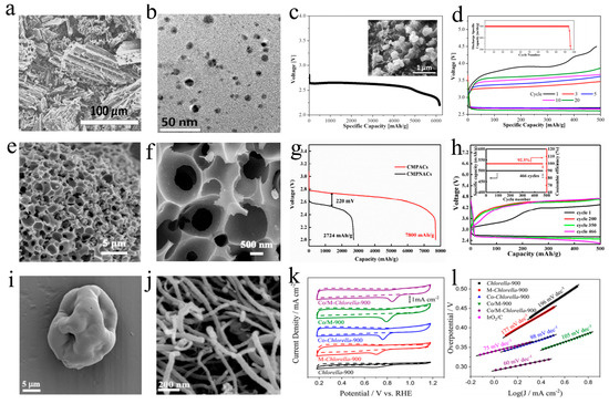 Biochars supported with catalyst being cathode materials for metal–air batteries; SEM image of biochars, electrochemical performance curves. (a–d) Sugarcane. Adapted with permission from ref. [100]. Copyright 2017, American Chemical Society. (e–h) Pomelo peel. Adapted with permission from ref. [38]. Copyright 2018, American Chemical Society. (i–l) Chlorella. Adapted with permission from ref. [113]. Copyright 2017, American Chemical Society.