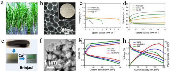 Compared with bacterial cellulose of nanofibers, the 3D N-doped carbon nanonet (SCC-N) derived from silkworm cocoons can be used as a carbon-based support for binder-free cathode. Through effective activation, honeycomb pores formed on the surface of carbon fibers with a large specific surface area. The Li–O2 battery with SCC-N cathode exhibit ultra-high capacity (1480 mAh g−1) and long cycle stability (60 times) due to the excellent structure and morphology of silkworm cocoons [121]. Wang et al. reported a new self-standing air cathode derived from sugarcane (Figure 6a) and egg for a Li–O2 battery, due to the egg providing enough O, N, P elements for the carbon matrix derived from sugarcane. Benefiting from the combined effect of double biomass and porous structure (Figure 6b), the Li–O2 battery with the egg–SC cathode shows excellent specific capacity (8.07 mAh cm−2 under 0.1 mA cm−2) (Figure 6c) and delivers ultra-low overpotential (Figure 6d) [44]. For the field of non-aqueous Li–air battery, LiOH being the product of negative reaction can reduce the cycle stability and increase the overpotential of Li–air battery caused by the difficult decomposition of LiOH. Liang and his colleagues obtained a 3D self-standing Co@NC anchored on biochar cathode (Co@NC/PPC) from pomelo peels, and Co@NC/PPC can stimulate the decomposition of LiOH and Li2O2. Meanwhile, Co@NC/PPC exhibited more excellent characteristics, including high specific surface area (211 m2 g−1), sufficient micro and mesoporous (1–4 nm) and the hierarchical structure. More importantly, the Li–O2 battery equipped with Co@NC/PPC also achieved desirable electrochemical performance, such as a positive ORR Eonset (2.96 V), a powerful OER peak (located at 3.2 V), an ultra-high capacity and a relatively long durability (136 cycles with 0.5 mAh cm−2 under 0.1 mA cm−2). A self-standing biochar (NiFeP/BC) supporting with nickel–iron phosphide nanoparticles was prepared by Liang via a simple strategy of carbonization and one-step phosphating process. Benefitting from the 3D framework with powerful mass transfer and the efficiency catalyst of NiFeP, the Li–O2 battery with NiFeP/BC cathode showed a satisfactory specific capacity (>10 mAh g−1) and a long-term cycle (90 times) [39].