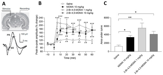 Figure 3A shows a scheme indicating the position of the stimulating and recording electrodes in the rat brain, as well as the averaged prefrontal cortical response evoked by contralateral stimulation of the corpus callosum in a saline control rat, prior to (basal responses, BR) and after (potentiated responses, PR) the application of the tetanizing train. Transcallosal responses evoked in the rat prefrontal cortex begin with an early downward surface positive deflection, followed by a late prominent upward surface negative wave. Detailed characterization of early and late components of these responses upon tetanization during in vivo recording, providing insight into which synapses, in which layer, are being activated during each component, has been described elsewhere [21,22,23,24]. Figure 3B shows the time course of changes in amplitude of prefrontal cortex evoked field responses prior to and after application of the potentiating train, applied 1 h after i.p. administration of either 10 mg/kg of MDMA, 1 or 10 mg/kg of 2-Br-4,5-MDMA, or saline. It can be observed that neither the drugs nor saline changed the peak-to-peak amplitude of cortical field responses prior to tetanization (between −10 and 0 min). Saline control rats exhibited about a 20% increase in peak-to-peak amplitude of cortically evoked responses after application of the tetanizing stimulation, which was maintained throughout the recording period, indicating LTP induction (intragroup statistics, * p < 0.05, ** p < 0.01, two-way ANOVA followed by Bonferroni multiple comparisons test). Intraperitoneal administration of 10 mg/kg MDMA nearly tripled the potentiating effect of the tetanizing train (implying an increase in LTP), as the peak-to-peak amplitude of cortically evoked responses increased by approximately 60% 10 min after the MDMA injection, an effect that was maintained throughout the recording session (intragroup statistics, # p < 0.05, ## p < 0.01, ### p < 0.001, two-way ANOVA followed by Bonferroni multiple comparisons test).