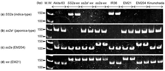Analysis of nucleotide polymorphisms and mutation sites in starch synthase (SS) IIa and waxy (Wx) genes. (a,b) Genotyping the high activity-type SS2a allele derived from indica rice (a) and low activity-type ss2aL allele derived from japonica rice (b) based on nucleotide polymorphisms in the first exon of the SSIIa gene. (c) Identification of the ss2a allele derived from EM204 based on the mutation site in the fifth intron of the SSIIa gene. (d) Identification of the wx allele derived from EM21 based on the mutation site in the seventh exon of the Wx gene. Two samples each were prepared from individual seedlings of the same genotype.