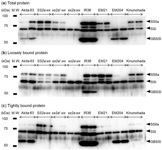 Since SSIIa from indica rice tends to associate with starch granules, unlike that of japonica rice [3], the starch granule affinity of SSI, SSIIa, and GBSSI was investigated in this study (Figure 2b,c). A large proportion of SSIIa was associated with starch granules in SS2a lines, such as IR 36 and SS2a wx, but less SSIIa was associated in ss2aL lines, including Akita 63, ss2aL wx, EM21, and Kinunohada (Figure 2b,c). This suggests that the four known amino acid substitutions between indica and japonica SSIIa proteins [19] affect their affinity for starch granules. SSIIa was not detected in either the loosely bound or tightly bound protein fractions of ss2a wx and EM204 (Figure 2b,c), as expected.