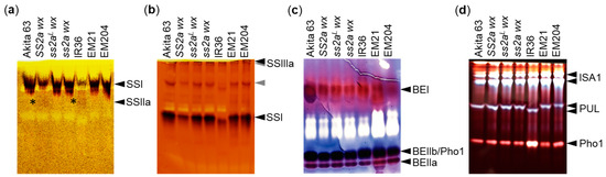 SSI and SSIIIa activities were visualized by native-PAGE using oyster glycogen in the presence (Figure 3b) or absence (Figure S1b) of ADP-glucose (substrate). Compared with SS2a lines, SSI activity appeared to be stronger in ss2aL and ss2a lines, such as Akita 63, ss2aL wx, ss2a wx, EM21, and EM204; this may be because the amount of SSI in the soluble protein fraction in these lines was higher, as the amount of SSI tightly associated with starch granules was lower than those of the lines with SS2a (Figure 2c). The activity of SSIIIa was similar among all lines. Faint bands, indicated by gray arrowheads and likely representing transferase or hydrolase activities, also appeared in the absence of the substrate (Figure S1b). The activities of other starch biosynthetic enzymes, such as BEs, ISA1, and PUL, were also similar across most of the lines, although the mobility of PUL was faster in IR36 than in other lines. Additionally, the activity of phosphorylase 1 (Pho1) was stronger in IR36 than in other lines (Figure 3c,d).