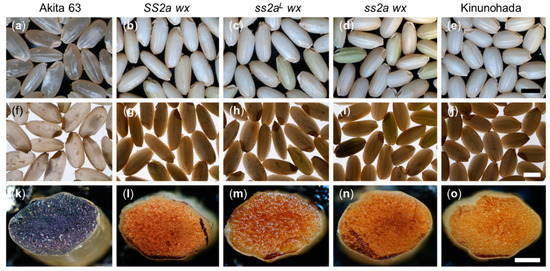 Morphologies of dehulled rice seeds were observed using a stereomicroscope with light from above (Figure 4a–e) and below (Figure 4f–j). The SS2a wx, ss2aL wx, ss2a wx, and Kinunohada seeds were white and opaque, which is typical of glutinous rice seeds, when illuminated from above (Figure 4g–j). This is consistent with the appearance of other wx rice seeds [41]. The seeds of non-glutinous rice Akita 63 were translucent when illuminated from above (Figure 4f). When illuminated from below, the seeds of glutinous rice lines SS2a wx, ss2aL wx, ss2a wx, and Kinunohada appeared dark (Figure 4g–j).