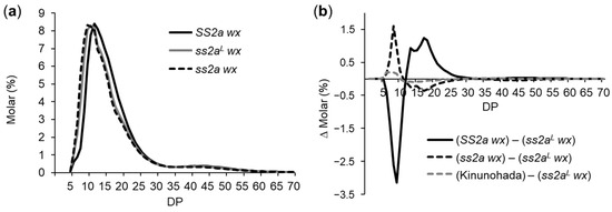 Since amylose content reflects the Wx genotype and GBSSI content, and the SS2a wx, ss2aL wx, ss2a wx, and Kinunohada lines were found to be glutinous with some variation in amylopectin structure, their amylopectin structure was determined by capillary electrophoresis to reveal the effect of SSIIa alleles (Figure 5a,b). Analysis of the chain length distribution patterns of SS2a wx, ss2aL wx, and ss2a wx indicated that the amylopectin chains of ss2a wx were slightly shorter than those of ss2aL wx, while SS2a wx possessed slightly longer amylopectin chains than ss2aL wx (Figure 5a).