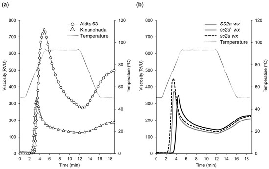 Pasting properties of endosperm starch suspension in water, as analyzed with an rapid visco analyzer (RVA). (a) Viscogram of Akita 63 and Kinunohada. (b) Comparison of the viscograms of SS2a wx, ss2aL wx, and ss2a wx. Data represent the average of three replicates. Parameters of pasting properties are shown in Figure S4a. Comparison of the viscogram of Kinunohada with that of near isogenic rice lines (NILs) is shown in Figure S4b.