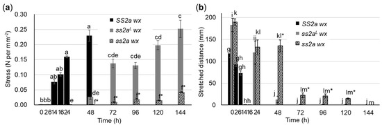 Viscoelasticity of rice cakes prepared from purified starch and stored at 4 °C. (a,b) Compression test (a) and stretching test (b) of rice lines performed using a tabletop universal tensile testing machine. Rice cakes of SS2a wx were stored at 4 °C for 0, 2, 6, 14, 16, 24, and 48 h, while those of ss2aL wx and ss2a wx were stored at 4 °C for 0, 24, 48, 72, 92, 120, and 144 h. Data represent the mean ± SE of three replicates. Different lowercase letters indicate significant differences among different storage time of individual line (Tukey–Kramer method, p < 0.05); SS2a wx (a, b), ss2aL wx (c, d, e) and ss2a wx (f) for compression tests, and SS2a wx (g, h), ss2aL wx (i, j) and ss2a wx (k, l, m) for stretching tests. Asterisks indicate significant differences between ss2aL wx and ss2a wx at the same storage time (t-test, p < 0.05).