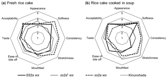 Pairwise comparisons of the three NILs (SS2a wx, ss2aL wx, and ss2a wx) were performed against the commonly consumed glutinous rice cultivar Kinunohada (control) in the Akita region. Evaluation was performed using a five-point hedonic scale, and scores for Kinunohada were set at three. Sensory parameters including appearance, softness, consistency, stretchiness, mouthfeel, ease of bite off, taste, and acceptability were evaluated (Figure 8). Fresh rice cakes prepared from ss2a wx were the softest and showed the highest consistency and stretching ability but were more difficult to bite off compared with those prepared from SS2a wx, ss2aL wx, and Kinuohada. Fresh rice cakes prepared from SS2a wx, ss2aL wx, and ss2a wx showed similar appearance, mouthfeel, and taste, and their acceptability was higher than those prepared from Kinunohada. Rice cakes cooked in soup exhibited similar softness, taste, and acceptability among SS2a wx, ss2aL wx, and ss2a wx. The softness of rice cakes varied with the cooking method, probably because rice cakes served in the hot soup did not retrograde unlike fresh rice cakes, which were served at room temperature and likely retrograded to some degree. The rice cakes of SS2a wx served in soup showed lower consistency and stretchiness but were easier to bite off than those of ss2aL wx and ss2a wx; this result was in contrast with the evaluation of fresh rice cakes. The consistency of rice cakes and the ease of bite off showed an inverse relationship for both fresh and cooked rice cakes; the less sticky the rice cake, the easier the process of chewing and swallowing. Thus, SS2a wx would be the most suitable NIL for preparing rice cakes to be cooked in soup and served to the elderly and young children, while ss2a wx would be most suitable for preparing rice cakes to be served fresh. The taste and acceptability of SS2a wx, ss2aL wx, and ss2a wx rice cakes scored higher than those of Kinunohada rice cakes, suggesting that these three NILs are suitable for commercial use, and that some other factors such as proteins, lipids, and other aromatic compounds potentially influence the taste of rice cakes.