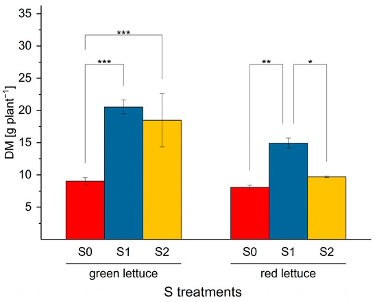 Dry matter (DM) accumulation in green and red multi-leaf lettuce grown in a hydroponic system under varied S levels (S0: 0 mM, S1: 1 mM, and S2: 1.5 mM, K2SO4). Values represent the mean ± SD of independent replicates (n = 4). Asterisks indicate the different levels of significance; (* p ≤ 0.05; ** p ≤ 0.01; *** p ≤ 0.001); no asterisks mean there is no significance.