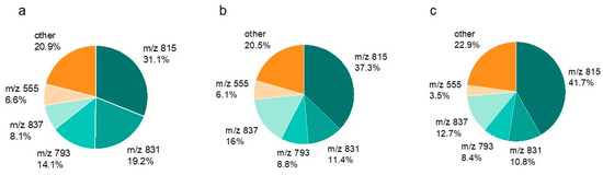 Distribution of the most abundant sulfoquinovosyl diacylglycerol derivatives (SQDG) (%) in relation to total SQDG content in red multi-leaf lettuce. Plants were treated with (a) S0: 0 mM, (b) S1: 1 mM, and (c) S2: 1.5 mM K2SO4. Individual SQDG were displayed with their mass to charge ratio (m/z).
