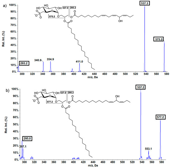 In the analyzed lettuce samples, the oxidized SQDG (SQDG-OH) could be detected. The SQDG were first identified by their specific fingerprint fragments (m/z 81, m/z 165, and m/z 225) [35]. Additionally, specific fragments of hydroxy fatty acids (m/z 293; 18:3-OH, m/z 295; 18:2-OH) allowed direct characterization of individual oxidized SQDG. A representative example of the specific fragmentation pattern for oxidized SQDG is shown in Figure 5a,b. Based on these hydroxy fatty acids fragments, the oxidized species SQDG-831, SQDG-833, and SQDG-853 were detected. SQDG-OH (m/z 831), the most common SQDG-OH, is the oxidized linolenic acid (18:3-OH) equivalent of SQDG-815. SQDG-833 is the LOH equivalent to SQDG-817, and SQDG-853 is equivalent to SQDG-837. A preferential oxidation of SQDG-837 is most likely due to the two attached PUFA (18:3/18:3). The decrease in the enrichment factors of SQDG-OH leads to the assumption that these are formed preferentially under S deprivation conditions. With regard to SQDG-831 and SQDG-833, a clear decrease in the percentage distribution in the membrane is visible (Figure 6). This decrease is further demonstrated by the enrichment factor. When the concentrations in the different S supply levels were not altered, the enrichment factor is one. However, there were enrichment factors of 4.1 and 3.7 (SQDG-831 and SQDG-833), which indicated that the concentrations of these individual SQDG were enriched; however, the concentration has increased less than the total SQDG concentration. The total SQDG concentration in plants for S2 level was 7.2 times higher than the total content in S0 level (enrichment factor 7.2). In summary, the concentration of all detected SQDG-OH were decreased by S nutrition in lettuce.
