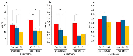 (a–c). Contents (%) of individual hydroxylated sulfoquinovosyl diacylglycerol derivatives, (a) SQDG-831; (b) SQDG-833; and (c) SQDG-853, in green and red multi-leaf lettuce grown under different S treatments. Values represent the mean ± SD of independent replicates of lettuce treated with S0: 0 mM (ngreen leaf = 4; nred leaf = 1), S1: 1 mM (ngreen leaf = 6; nred leaf = 5), and S2: 1.5 mM (ngreen leaf = 5; nred leaf = 2) K2SO4, respectively. Asterisks indicate the different levels of significance (* p ≤ 0.05; ** p ≤ 0.01; *** p ≤ 0.001); no asterisks mean that there is no significance.