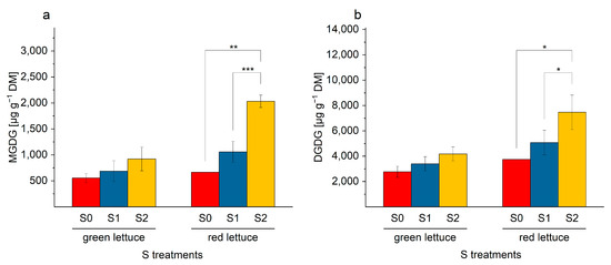 (a,b). Total contents [µg g−1 DM] of (a) monogalactosyl diacylglycerol (MGDG) and (b) digalactosyl diacylglycerol (DGDG) in green and red multi-leaf lettuce grown under different S treatments. Values represent the mean ± SD of independent replicates of lettuce treated with S0: 0 mM (ngreen leaf = 4; nred leaf = 1), S1: 1 mM (ngreen leaf = 6; nred leaf = 5), and S2: 1.5 mM (ngreen leaf = 5; nred leaf = 2) K2SO4, respectively. Asterisks indicate the different levels of significance (* p ≤ 0.05; ** p ≤ 0.01; *** p ≤ 0.001); no asterisks mean that there is no significance.