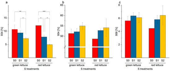 (a–c). Content (%) of individual digalactosyl diacylglycerol derivates (a) DGDG-934; (b) DGDG-954; and (c) DGDG-956, in green and red multi-leaf lettuce grown under different S treatments. Values represent the mean ± SD of independent replicates of lettuce treated with S0: 0 mM (ngreen = 4; nred = 1), S1: 1 mM (ngreen = 6; nred = 5), and S2: 1.5 mM (ngreen = 5; nred = 2) K2SO4, respectively. Asterisks indicate the different levels of significance (* p ≤ 0.05; ** p ≤ 0.01; *** p ≤ 0.001); no asterisks mean that there is no significance.