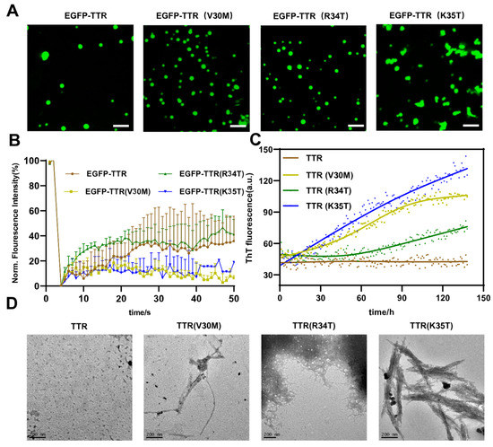 2.3. Disease-Associated Mutations Accelerate TTR Droplets Maturation and Aging into Fibrils