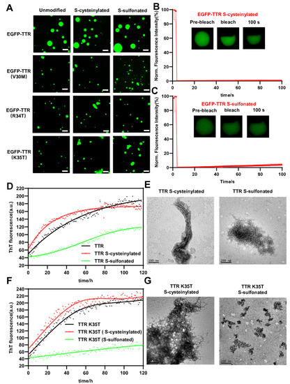 2.4. The Effects of S-cysteinylation and S-sulfonation on TTR Droplets and Aggregation