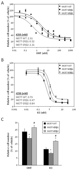 ERβ1 and ERβ2 inversely affect the antiproliferative efficacy of OHT and ICI. (A,B) Proliferation of MCF7-WT, MCF7-ERβ1 and MCF7-ERβ2 cells treated with vehicle (0.1% DMSO), increasing concentrations of OHT (A) or increasing concentrations of ICI182,780 (B) for six days. Relative cell numbers were expressed as percentage of the cell number of vehicle-treated cells. Plots are representative of at least three independent experiments carried out in triplicate. (C) Proliferation of MCF7-WT, MCF7-ERβ1 and MCF7-ERβ2 cells treated with vehicle (0.1% DMSO), ICI (30 nM) or OHΤ (300 nM) for six days. Relative cell numbers were expressed as percentage of cell number of vehicle-treated cells. Values are mean ± SEM of at least three independent experiments carried out in triplicate. * p < 0.05 vs. MCF7-WT, # p < 0.05 vs. MCF7-ERβ1 (t-test). OHT, 4-hydroxytamoxifen; ICI, ICI182,780.