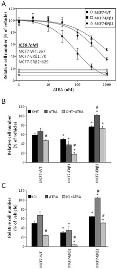 It has been reported that the combination of ATRA and OHT suppressed proliferation and viability of MCF7 cells more than OHT [10,11]. We corroborated these findings and further showed that the combination of ATRA with either OHT or ICI suppressed proliferation and viability of MCF7-ERβ1 cells more effectively than those of MCF7-WT cells and that the combination of ATRA with either OHT or ICI suppressed proliferation of MCF7-ERβ2 cells less effectively than that of MCF7-WT cells.
