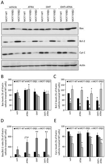 Modulation of Bax, Bcl-2 and cytochrome c expression by OHT, ATRA and their combination. (A) Western blot analysis of whole cell extracts from 2 × 105 MCF7-WT, MCF7-ERβ1 and MCF7-ERβ2 cells treated for 24 h with vehicle (0.1% DMSO), OHT (100 nM), ATRA (50 nM) or their combination, as indicated. Antibodies against Bax, Bcl-2, cytochrome c and actin (loading control) were used. (B–E) Densitometric analysis of Bax (B), Bcl-2 (C) and cytochrome c protein bands. Density of Bax, Bcl-2 and cytochrome c protein bands was normalized to density of the respective actin bands and expressed relative to that of vehicle-treated MCF7-WT cells. The Bax/Bcl-2 ratio was calculated from the respective Bax and Bcl-2 band densities. * p < 0.05 and (*) p = 0.07 vs. vehicle of the respective cell line, # p < 0.05 and (#) p = 0.08 vs. similarly treated MCF7-WT cells. OHT, 4-hydroxytamoxifen; ATRA, all-trans retinoic acid.