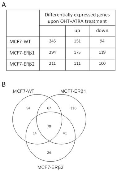 Global transcriptional profile of MCF7-WT, MCF7-ERβ1 and MCF7-ERβ2 cells in response to treatment with OHT in combination with ATRA. (A) The number of differentially expressed genes in MCF7-WT, MCF7-ERβ1 and MCF7-ERβ2 cells upon treatment with OHT (100 nM)+AΤRA (50 nM). (B) Venn diagram representing the overlap between differentially expressed genes in MCF7-WT, MCF7-ERβ1 and MCF7-ERβ2 cells. OHT, 4-hydroxytamoxifen; ATRA, all-trans retinoic acid.