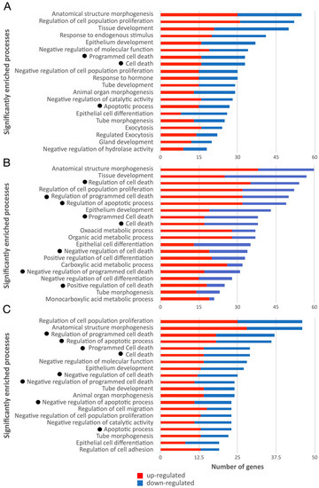 Enrichment analysis of biological processes related to genes regulated by OHT in combination with ATRA. Statistically significantly enriched biological processes based on Gene Ontology enrichment analysis, with the number of corresponding genes, upon treatment of MCF7-WT (A) MCF7-ERβ1 (B) and MCF7-ERβ2 cells (C) with OHT in combination with ATRA. The number of significantly differentially expressed genes involved in each process is shown on the X axis, with red and blue colors corresponding to up- or downregulation, respectively. Cell-death-related processes are indicated with dots. OHT, 4-hydroxytamoxifen; ATRA, all-trans retinoic acid.