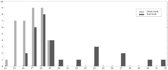 Preeclampsia onset week and the week of the pregnancy end by the number of cases reported.