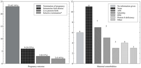 Pregnancy outcome—number of cases (%); maternal comorbidities—number of cases. * Selective termination and live birth of other twin/triplets. APS—antiphospholipid syndrome, PPH—pre-pregnancy hypertension.