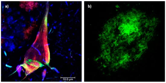 Histopathological hallmarks of Alzheimer’s disease. (a) Triple immunofluorescence showing a neurofibrillary tangle (conformational change: green channel; C-terminal tail: red channel; N-terminal of intact tau protein: blue channel). (b) Immunofluorescence showing an amyloid plaque (Aβ 1-40: green channel). Photomicrographs at 100X, calibration bar = 10 µm.
