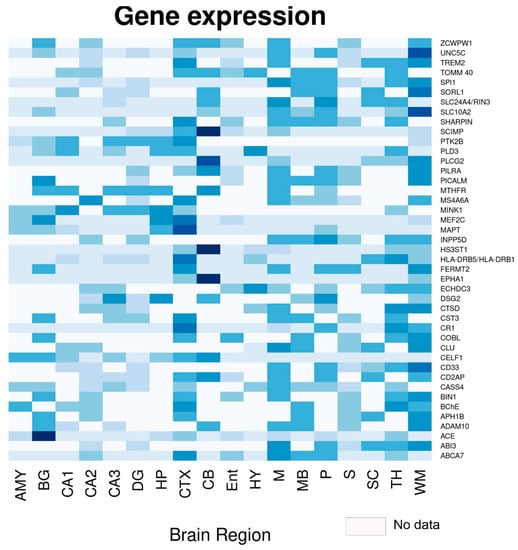 Figure 3 illustrates the expressions of several genes in regions of the brain, highlighting that many of these are highly expressed in the hippocampus, the main neuroanatomical region affected in AD. Remarkably, CD33, DSG2, MEF2C, MINK1, PTK2B, CD2AP, PICALM, BIN1, MTHFR, PLD3, and TOMM40 are highly expressed in the hippocampus. They are related to various pathological processes (Figure 2, Table 1), mainly abnormal Tau and Aβ processing, synaptic dysfunction, and neuroinflammation, highlighting the causal role of the immune system, rather than the immune response as a consequence of the disease. The neuroimmunomodulation hypothesis postulates that AD is a consequence of the response mainly of microglial cells that trigger a neuroinflammatory response and the subsequent neurodegeneration [43,44,45,46]. Furthermore, CD2AP, CD33, BIN1, CR1, PICALM, ABCA7, TREM2, and CLU are strongly expressed in the hippocampus (Figure 3) and represent highly expressed risk genes in microglia; hence, they are associated with the immune response in AD [144]. This is highly relevant since these genes represent a window for the establishment of early biomarkers and therapeutics focused on limiting the neuroinflammatory environment.