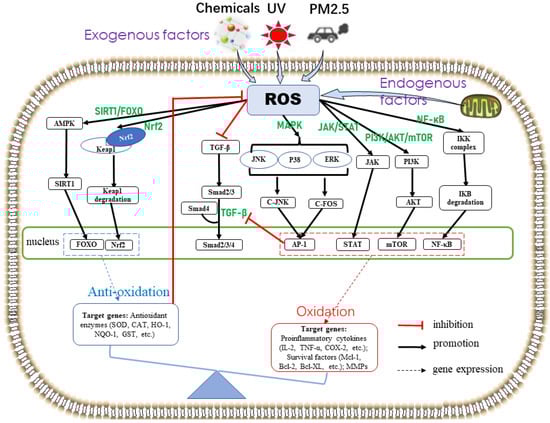 Skin oxidative stress-related signaling pathways. Exogenous stimuli (e.g., UV, chemicals, and PM2.5) and/or endogenous factors (e.g., mitochondrial oxidase and metabolism) induce ROS overproduction. ROS activate the antioxidant defense system and promote the expression of antioxidant enzymes through Nrf2 and SIRT1/FOXO pathways, which in turn reduce ROS production. When the antioxidant defense system fails to completely scavenge ROS, oxidative stress is induced. Excessive ROS activate MAPK, JAK/STAT, PI3K/AKT/mTOR, and NF-κB signaling pathways, thereby resulting in the expression of cytokines associated with skin cellular senescence, inflammation, and cancer. The transforming growth factor-β signaling pathway, related to collagen synthesis, is inhibited by ROS and the transcription factor AP-1 to accelerate skin cellular senescence.