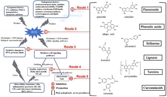 Cumulatively, the aforementioned research results demonstrate that plant polyphenols can be used to treat oxidative stress-induced skin cellular senescence, inflammation, and cancer, primarily through the five routes outlined below (Figure 3). Route 1: Plant polyphenols reduce endogenous ROS generation, including chelation of iron ions, to inhibit the Fenton reaction on the electron transport chain and inhibit intracellular oxidase activity. Route 2: The structural peculiarities of polyphenols allow them to directly neutralize excess ROS. Route 3: Polyphenols can directly reduce the oxidative damage caused to macromolecular substances. Route 4: Polyphenols can block ROS-mediated signaling pathways associated with skin cellular senescence, inflammation, and cancer. Route 5: Polyphenols can activate the cellular antioxidant system signaling pathway to produce antioxidant enzymes.