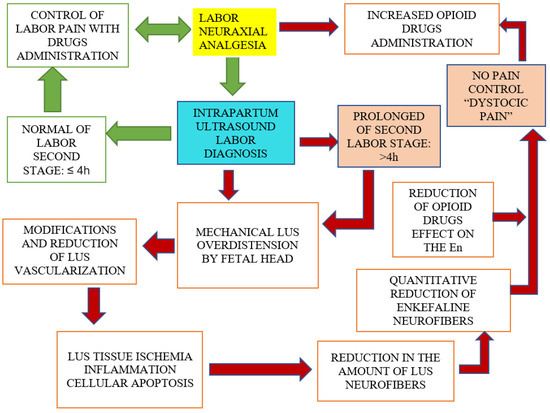 When the obstetric course of labor is not favorable and it turns into a prolonged labor, as indicated by the ACOG guidelines, it should be recommended to stop the LNA, since the PDL determines an LUS overdistension, ischemia, inflammation, and neuro fibers reduction, in particular, of the enkephalinergic neuro fibers, reported in Figure 1. The indication to suspend LNA in PDL patients is not due to the negative effect of LNA on labor, but to the need not to prolong labor beyond 4 h, to reduce maternal and fetal complications. The PDL evokes a particular kind of pain, a “dystocic pain”, which does not respond to analgesic and opioid drugs, commonly used during a CSE analgesia. It happens because Leu- and Met-enkephalin neuro fibers are depleted for the mechanical stress exercised to the LUS by the fetal head prolonged position in the PDL. The En reduction was shown in Figure 3.