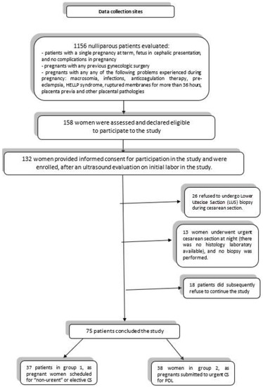 Of the 132 women enrolled, only 75 completed the study. The remaining 57 pregnant women were lost during the investigation for various reasons: 26 refused to undergo LUS biopsy, 13 women underwent urgent cesarean section at night (there was no histology laboratory available), and 18 patients subsequently refused to continue the study.