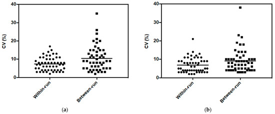 Distribution of within-run and between-run coefficient of variation of peak area for metabolites in (a) MDA-MB-231 cells and (b) HepaRG cells, from 2 × 105 cells.