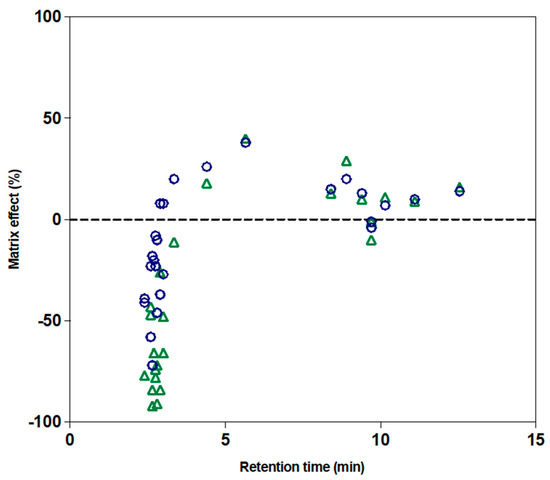 Blank cell extracts were not available since the compounds studied were endogenous metabolites. Thus, the ME was determined using an approach with surrogate analytes of endogenous metabolites, including 28 labeled metabolites spiked at the same level in cell extracts and in a pure solution of the mobile phase. The ME ranged from −92% to +40%. The RT appeared as an important parameter since analytes eluted before 3 min were associated with higher negative values of the ME (Figure 3). This could be explained by an alteration of the ionization due to competition between a high number of compounds in the ion source. For the short RTs, the MEs were also increased together with the cell number used for the extraction (1 × 105 vs. 5 × 105 cells, Figure 3).