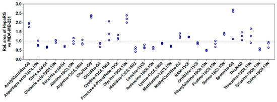 Relative response of the 28 labeled metabolites spiked in cell extracts from HepaRG cells compared with MDA-MB-231 cells (n = 3, at 3 × 105 cells for all experiments). Peak areas in MDA-MB-231 cells were considered as the reference and normalized to 1. Rel.: relative.