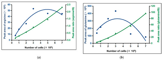- (iii) for the same metabolite and a given cell number, the nature of the cell line. For a low number of metabolites, such as aspartic acid, carnitine, glutamic acid, and phenylalanine, the variability was similar for MDA-MB-231 and HepaRG cell extracts. However, for the majority of metabolites, values of CV were different between MDA-MB-231 and HepaRG cells. For example, for arginine, CV values were lower than 4% for MDA-MB-231 cells, while they reached 18% for HepaRG cells. It was also observed for tryptophan with CV less than 10% for MDA-MB-231 cells and as high as 21% for HepaRG cells. If we focus on glutamine, we conclude that the optimal cell number was 0.5 × 105 for MDA-MB-231 cells (CV = 3%) and 2 × 105 for HepaRG cells (CV = 3%).