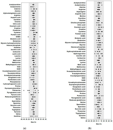 Having determined and chosen the internal calibration mode, the linearity of the method was assessed in both cell lines. Calibration experiments were performed with cell extracts from 0.5 × 105 to 7 × 105 cells. Curves were established and performances were calculated only for metabolites showing a signal from 0.5 × 105 or 1 × 105 to 7 × 105 cells (corresponding to at least five standards). This represented a total of 53 metabolites, among which 49 were common to both cell lines. Linearity, based on bias between theoretical and calculated cell number, was validated (<20%) for all metabolites, except GABA and putrescine for MDA-MB-231 cells (Figure 6). To be noted, the linearity of these two metabolites was validated in HepaRG cells, indicating an impact of the nature of cell line also on linearity.