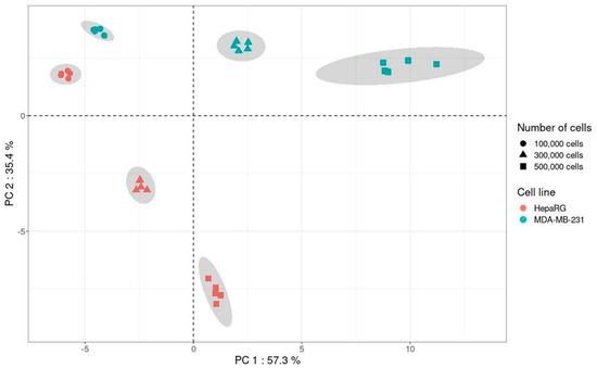 A principal component analysis (PCA) including the quantitatively analyzed metabolites in both cell lines was performed using CV values from 1, 3, and 5 × 105 cells for each cell line (Figure 7).