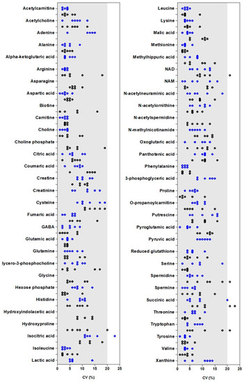 - (i) the nature of the metabolite. For example, in MDA-MB-231 cell extracts, the CV of cysteine and creatinine (values between 7 to 19%) were higher than those of arginine and leucine (all CV ≤ 5%).