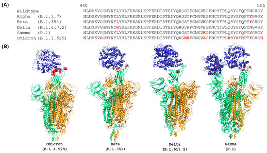 As of November 2021, multiple VOCs have been reported, including Alpha (B.1.1.7), Beta (B.1.351), Delta (B.1.672.2), Gamma (P.1), and Omicron (BA.1, BA.2, and BA.3) [22,23]. Of these VOCs, Omicron is the currently dominant variant, and over 300 subvariants of Omicron have emerged since November 2021. The remarkable feature of Omicron is that its spike protein has 15 more mutations in the RBD than that of the wildtype spike protein, much more than the other variants, such as Delta, whose spike protein RBD has two mutations. These mutations result in higher binding affinities with ACE2 compared to wild type and other variants [24] (Figure 1). Figures were created using PyMol version 2.0 [25]. Moreover, BA.1, BA.2, and BA.3 are the main subvariants of Omicron reported [26,27]. As of November 2021, BA.2 Omicron had higher transmission rates but less severe symptoms than BA.1 [28]. Compared with BA.1 and BA.2, BA.3 has a low prevalence. These three sublineages have mutations in the RBD of the spike protein, but their mutations are different [29]. For example, BA.2 has unique mutations such as T376A, D405N, and R408S. Therefore, though the reported Omicron variant and its sublineages have homologous sequences, their transmission and symptom features are different. So far, over 600 structures of full-length SARS-CoV-2 spike proteins, including wild type and variants, have been characterized and deposited in the Protein Data Bank (PDB) (https://www.rcsb.org/, accessed on 23 August 2022) [30]. Open- and closed-forms of spike proteins as well as transitional states of the spike protein with 1 or 2 RBD up conformations have been reported. Only the structures of the full-length Omicron spike protein, with and without ACE2, deposited at the PDB website by the end of August 2022 were considered in this review.