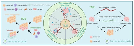 Immunoregulation and tumor microenvironment. (A) Depending on the number and spatial distribution of T cells, the tumor microenvironment can be divided into three types: immune inflammatory, immune rejection, and immune desert. (B) Schematic representation of immune evasion within the tumor microenvironment. (C) Three ways of tumor metastasis: lymphatic metastasis, hematogenous metastasis, and implantation metastasis.