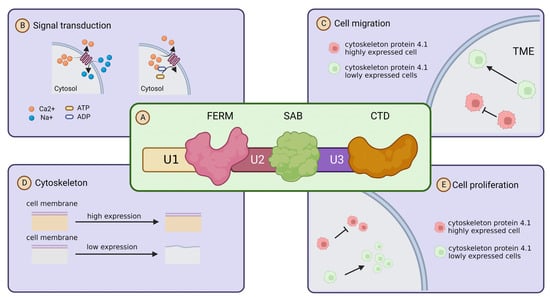 Cytoskeleton protein 4.1 members are encoded by different paralogous homologs, but all of its family members share three highly conserved structural and functional domains, namely, the actin-binding (SAB) and c-terminal (CT) domains, and a highly conserved structural domain consisting of 200–300 amino acids []. Through the three highly conserved structural domains, Cytoskeleton protein 4.1 is able to bind to membrane molecules, which is the basis for the role of Cytoskeleton protein 4.1 in signal transduction. In addition, Cytoskeleton proteins have three unique structural domains, U1, U2 and U3, and they confer different characteristics to the Cytoskeleton protein 4.1 family members [,,] (Figure 2A). Cytoskeleton protein 4.1 was initially found to act as an adapter capable of connecting membrane proteins to cytoskeleton proteins to the cytoskeleton []. It is an essential component of the membrane backbone and plays a key role in membrane backbone stability and protein complex assembly. As research progressed, researchers found that Cytoskeleton protein 4.1 not only exists as an adapter and membrane skeleton, but also directly participates and influences various cellular activities such as migration [,]. Uncontrollable metastasis is one of the most remarkable biological features of malignant tumors []. Cytoskeleton protein 4.1 is localized on the cell membrane, and in addition to acting as a cytoskeleton to maintain cell morphology, it is also able to influence the migration of tumor cells or other malignant features such as proliferation and signal transduction through multiple signaling pathways and molecules [] (Figure 2B–E).