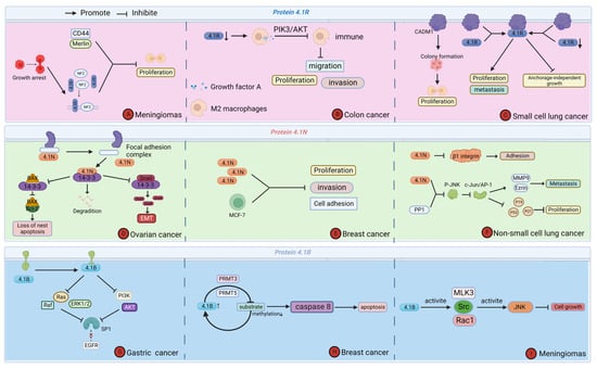 Meningiomas are common central nervous system tumors, and an NF2 inactivation is an early event in the development and progression of meningiomas []. A study by Robb et al. showed that protein 4.1R is frequently expressed at reduced levels or is even absent in meningioma patient tissues compared to normal subjects, and the same results were found in two meningioma cell lines, IOMM-Lee and CH157-MN []. The NF2 gene encodes Merlin protein, which is structurally related to protein 4.1R, is enriched to the membrane during growth arrest, and interacts with a subset of Merlin proteins associated with tumor suppressor functions and components such as CD44 to inhibit the proliferation of meningioma cells and negatively regulate cell growth. M2 macrophages are an important class of immune cells within the tumor microenvironment []. In colon cancer, protein 4.1R expression was downregulated. Lu et al. showed that the knockdown of protein 4.1R reduced the phagocytic capacity of M2 macrophages and affected the immune process. The mechanism was that knockdown of protein 4.1R upregulated VEGFA secreted by M2 macrophages and activated the PI3K/AKT pathway, which inhibited the immune effect of M2 macrophages and promoted the proliferation, migration, invasion, etc., affecting the process of colon cancer development and progression, and is a potential therapeutic target for colon cancer []. Small cell lung cancer (SCLC) is a group of neuroendocrine tumors with rapid disease progression and a short natural course, most often metastatic at diagnosis, and usually exhibits chemoresistance, yet treatment with immune checkpoint inhibitors significantly improves overall patient survival []. Cell Adhesion Molecule 1 (CADM1) has been reported to influence the development of small cell lung cancer through its ability to inhibit the proliferation and metastasis of the disease. At the same time, CADM1 cytoplasmic structural domain mutants are excellent diagnostic markers and therapeutic targets for small cell lung cancer. Funaki et al. showed that protein 4.1R is a CADM1 downstream binding site in non-small cell lung cancer; that CADM1 can recruit protein 4.1R to the plasma membrane, promoting anchorage-independent growth of small cell lung cancer (SCLC) cells and influencing the development of small cell lung cancer; and that co-localization of the CADM1 protein 4.1R complex at the plasma membrane correlates with the pathological stage of small cell lung cancer and reflects the malignancy of small cell lung cancer pairs [].