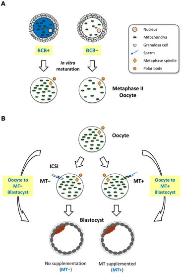 Communication between the nuclear and mitochondrial genomes is important for effective cellular function. It is well-documented that ATP generated through OXPHOS requires the replication of the mitochondrial genome to have taken place [] and that mtDNA copy is not uniform across all cell types but rather reflects the requirements of each cell type for OXPHOS-derived ATP []. Indeed, throughout development, there are changes in mtDNA copy that reflect the metabolic requirements of the developing embryo and foetus. For example, undifferentiated (pluripotent) cells have a requirement for low levels of OXPHOS-derived ATP [], as is the case for tumour-initiating cells [] whilst heart cells and neurons have high levels of the mtDNA copy number to support their complex functions []. A failure to mediate the interactions between the two genomes will inhibit key developmental processes, such as differentiation, and result in cellular arrest. However, the modulation of one genome can impact the other. For example, the use of DNA demethylation agents on tumour-initiating cells can result in increased differentiation potential and increased mtDNA copy number that take place in a synchronous fashion []. Likewise, the short-term depletion of mtDNA copy number can reset the differentiation potential of tumour-initiating cells whilst longer term depletion can inhibit tumorigenesis with both outcomes exhibiting differences in nuclear gene expression []. mtDNA deficiency in oocytes likely provides another example of how one genome is asynchronous with the other. Indeed, BCB− oocytes are indicative of poor developmental competence where nuclear and cytoplasmic maturation are not in synchrony. As a result, these oocytes frequently either fail to fertilise or arrest during preimplantation development [,], but they can be rescued through mtDNA supplementation []. Developmental competence can also be rescued through the addition of agents like NRG1 [] or the glycoside mogroside V [] to the oocyte maturation media, which impact the mtDNA copy number and enhance embryo development.