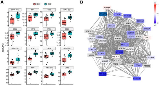 The expression of the mtDNA encoded and OXPHOS related genes in Sus scrofa oocytes. (A) mtDNA encoded genes and RNAs were differentially expressed between BCB+ and BCB− at significance (FDR < 0.05) and presented by jittered-boxplot. The results of individual transcripts are presented by positional order in the mitochondrial genome from top left to bottom right. Levels of expression were plotted on the y-axis as log2CPM value. (B) Potential protein interactions of identified DEGs involved in OXPHOS electron transport chain complexes III and IV and ATP synthase. The entire OXPHOS related protein interaction network is shown in Figure S2. Levels of differential gene expression between BCB+ and BCB− oocytes are shown as fold change by colour scale. Red and blue represent up- and down-regulation in BCB− oocytes. Genes in grey box have no DEG data due to low or no expression.